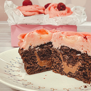 A supremely moist and decadent chocolate cupcake stuffed with creamy Nutella and topped with fresh raspberry frosting.