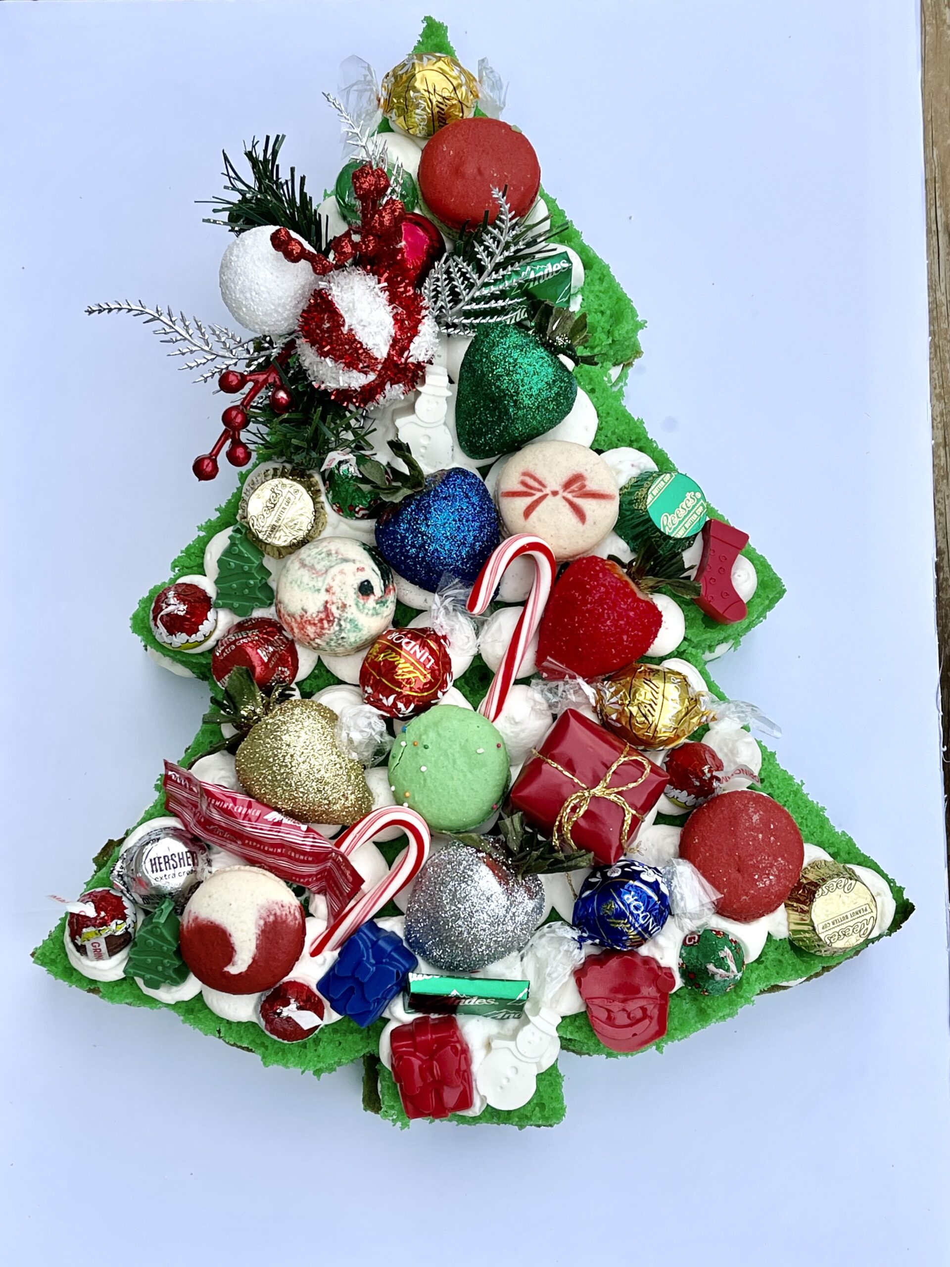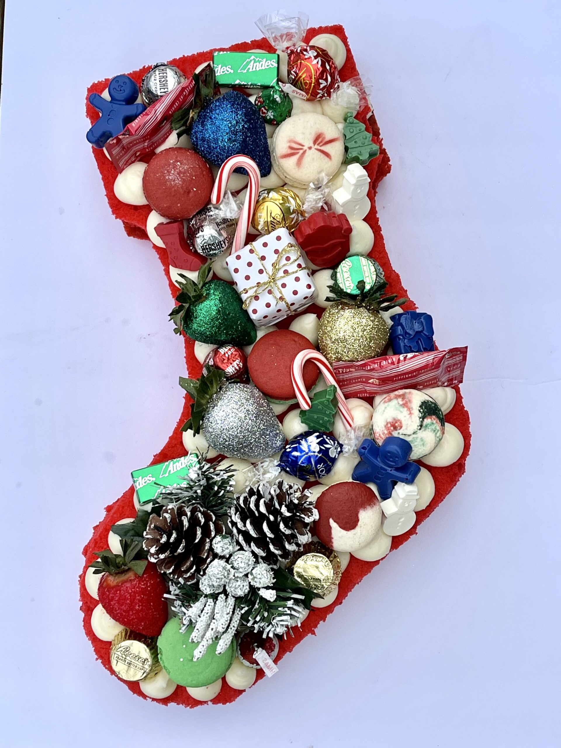 Choose between a Christmas Tree or a Christmas Stocking. A green or red vanilla cake with buttercream, cream cheese, or whipped cream frosting. The cakes are decorated with macarons, chocolate covered strawberries, Christmas chocolates, and candies. Each cake also has Christmas flowers and decor on top. Serves approximately 15-20.