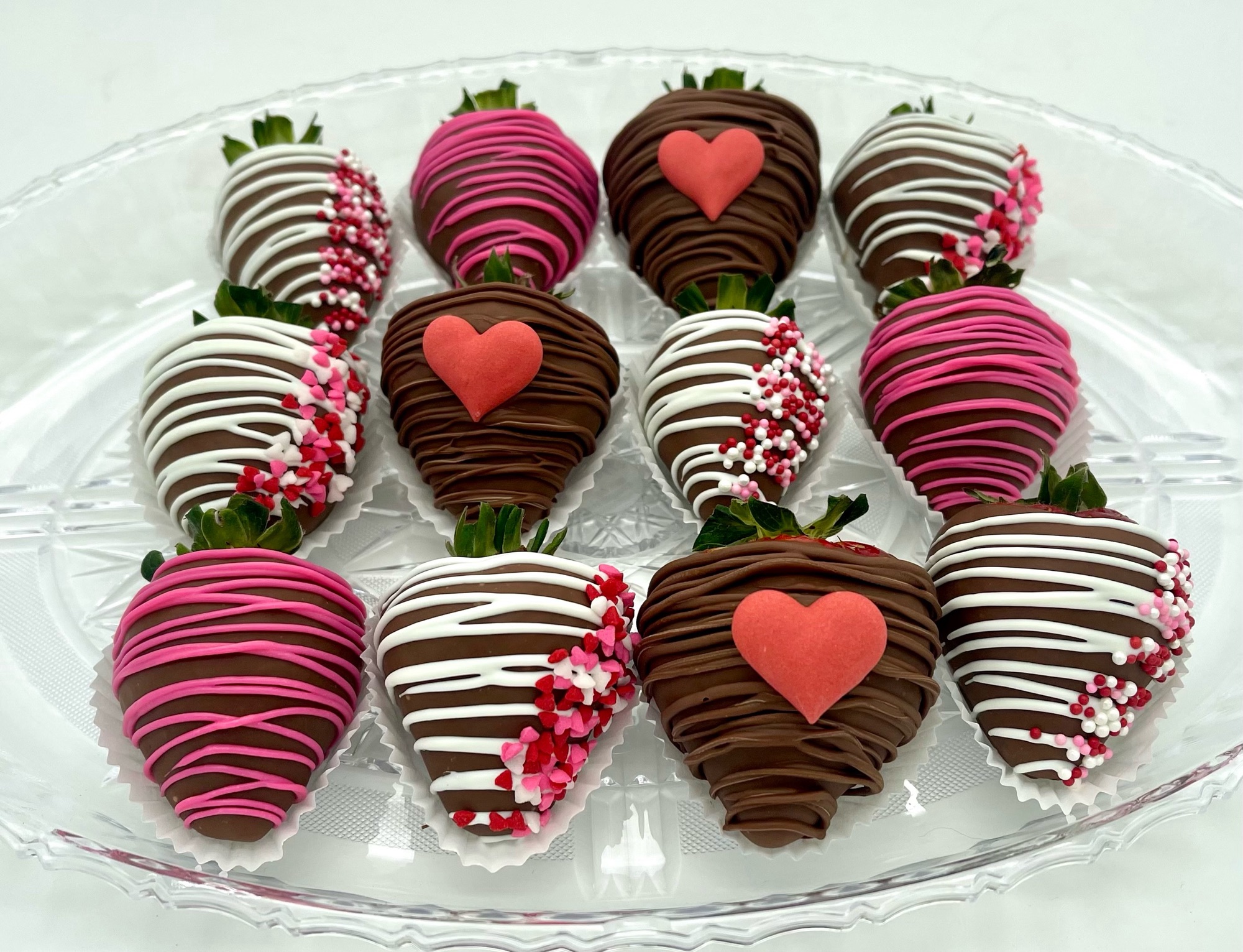 One dozen freshly dipped milk chocolate strawberries with Valentine’s accents in a tray.