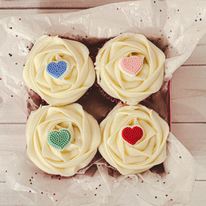 A moist, fluffy red velvet cupcake topped with a decadent and delicious cream cheese frosting and a royal icing heart decoration.